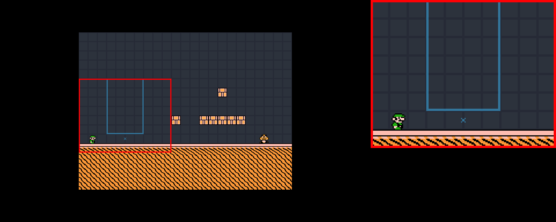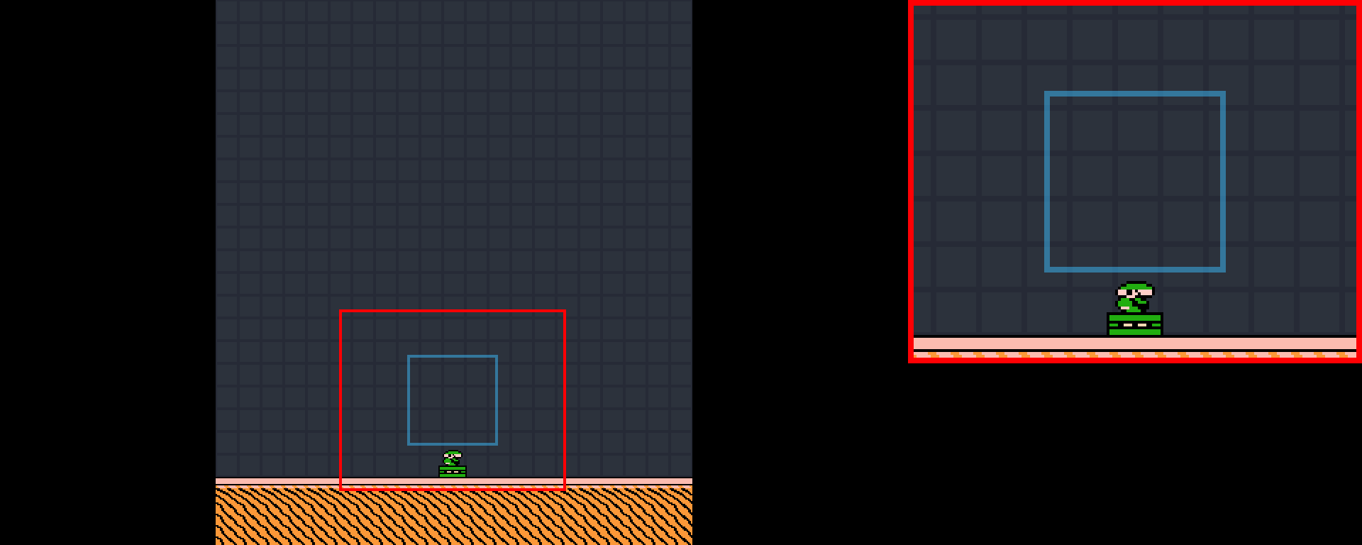 To show how far we've come, here's a comparison with the very first camera we tried (camera follows character x,y rigidly). The dynamic camera is much nicer, huh?