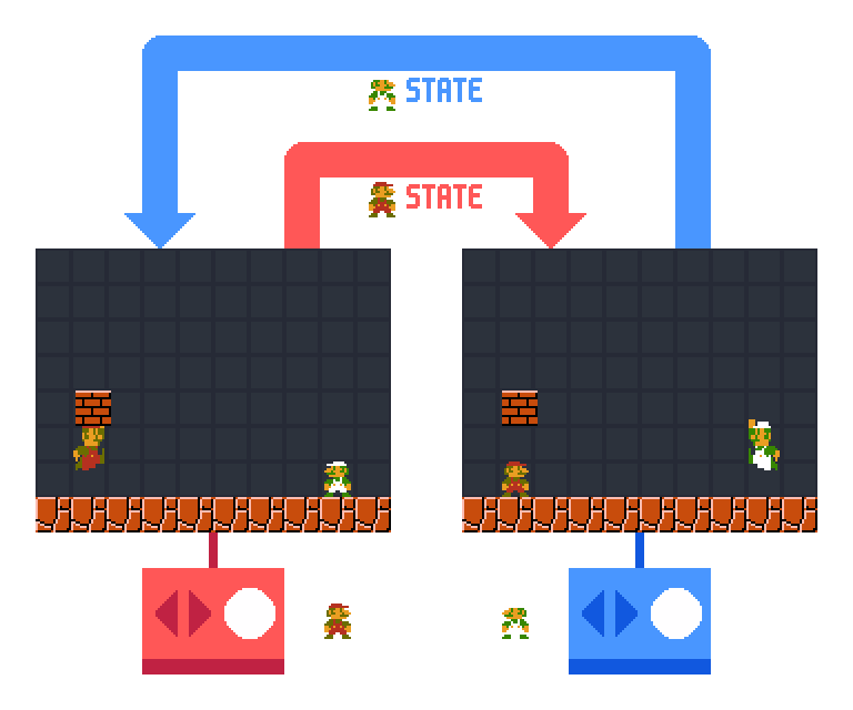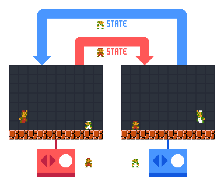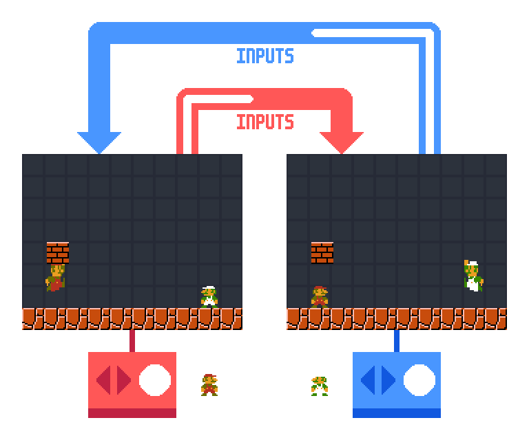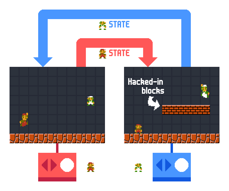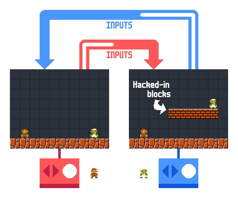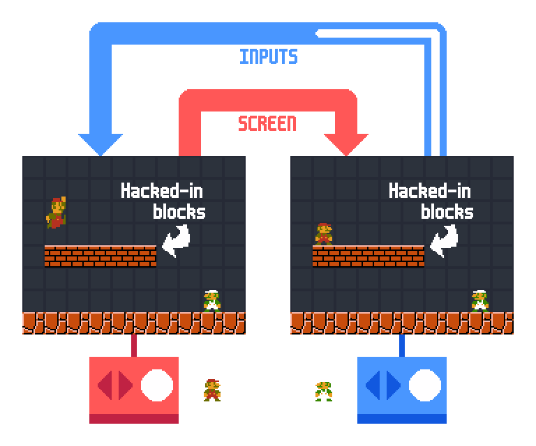 Notice how Mario still hits the block and gets the coin on P2's screen - even if it looks janky.