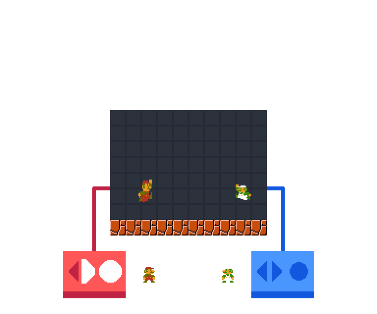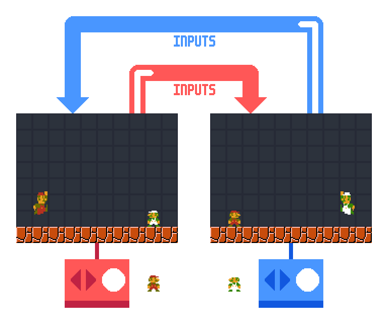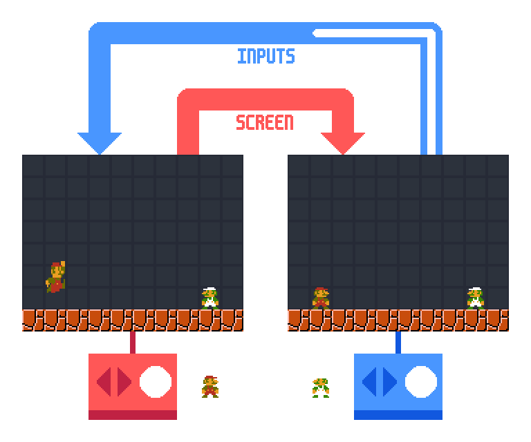 In other words, we make Mario's actions delayed on P1's screen, and we make Luigi's actions delayed on P2's screen.