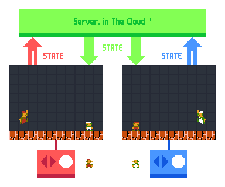 Well, it's not so simple. If you send each player's button presses over the internet (shown in this post with big arrows), there's some delay due to how far the signal must travel.