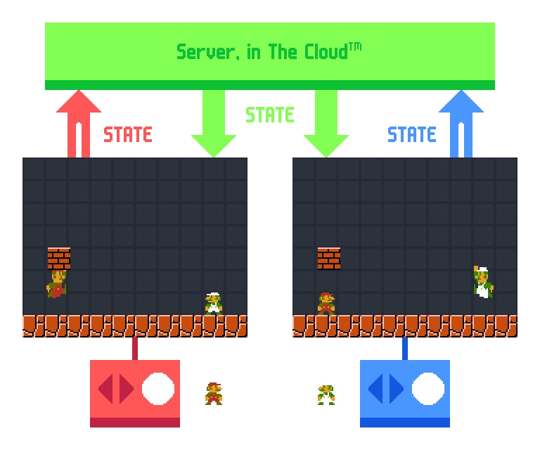 That is, instead of communicating Player 1 pressed jump, the client instead sends Mario is at position X: 20, Y: 34, and has 5 coins and so on.